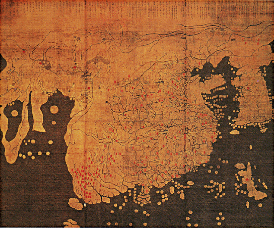 Esta cópia de 1470 é considerada como o mais antigo mapa topográfico do leste asiático. Mostra o delineamento da África e da península Arábica, com a Índia associada ao continente Chinês. A direita note a península da Coreia e as ilhas Japonesas.
