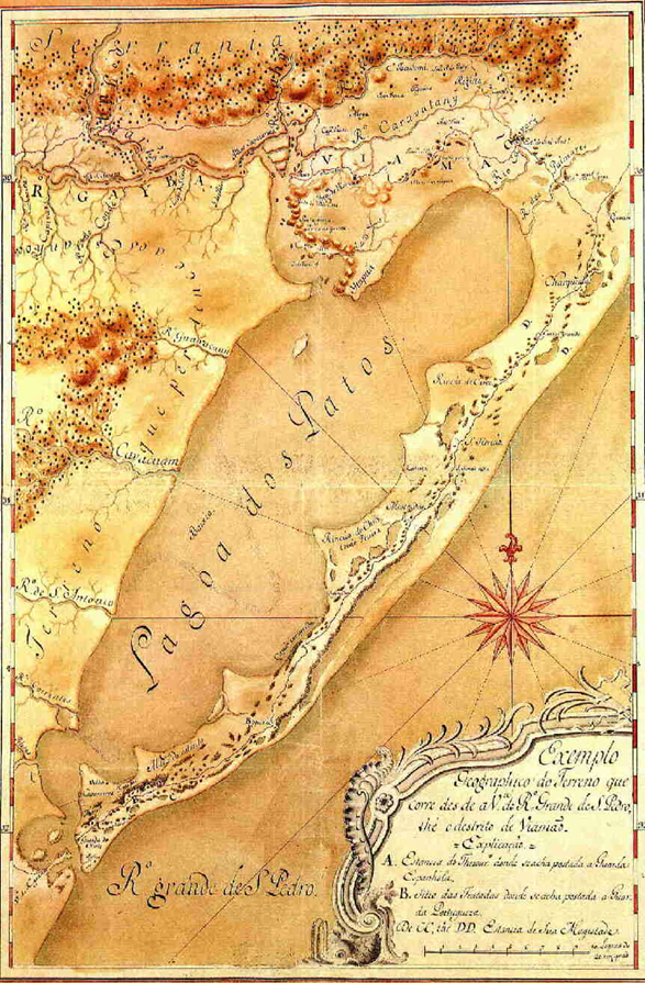 Destaca a extensão desde a Vila de Rio Grande de São Pedro até o Distrito de Viamão. Note a configuração da Lagos dos Patos.